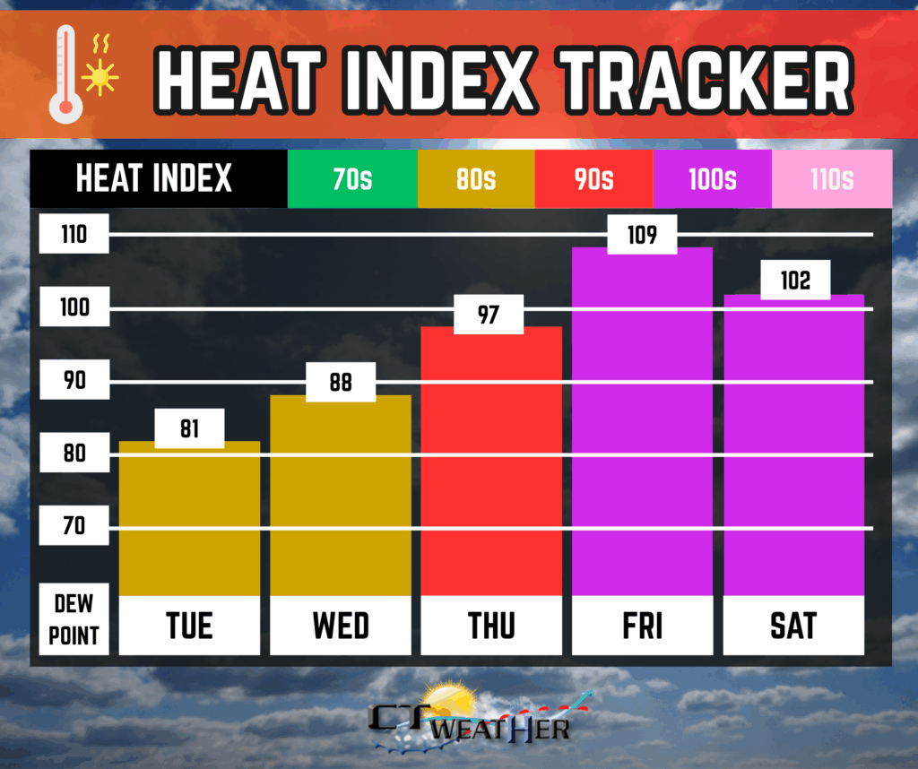 Friday is shaping up to be the hottest day of the week. High temperatures could soar into the 90s, and with high humidity, heat index values may exceed 100°F—possibly reaching 105°F in some areas. Heat advisories or even warnings may be issued. A cold front will approach late in the day, bringing a chance for scattered showers and thunderstorms, some of which could be strong.