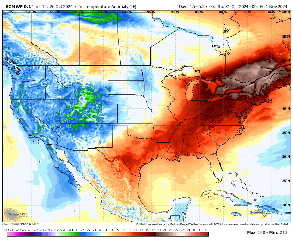 While dry weather remains dominant, the threat of rapid fire spread should decrease slightly early in the week due to increased humidity. The next chance of rain may come with a cold front on Friday, but there is still uncertainty about widespread rainfall. Right now, at least scattered showers are expected throughout Southern New England. Models are hinting at a more soaking rainfall 8 to 10 days out, but a lot can change at this forecast range. European model valid the morning of November 5th below – at least were seeing some green.