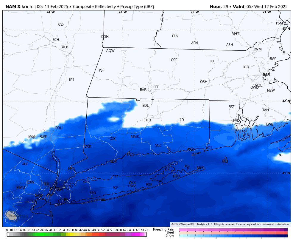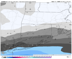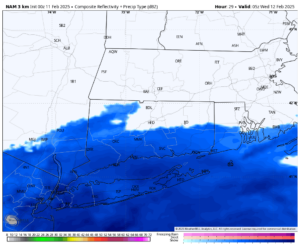 Tuesday Night: Coastal areas have the best chance of seeing a light accumulation of snow as a system slides to our South. Not expecting this to be a big deal at the moment, but can’t rule out an inch or two in coastal CT. The latest NAM model bumped things up a bit, so should there be any northern trend in the system overnight, updates will be provided. Expected timing for snowfall is approximately 12 AM to 4 AM on Wednesday.
