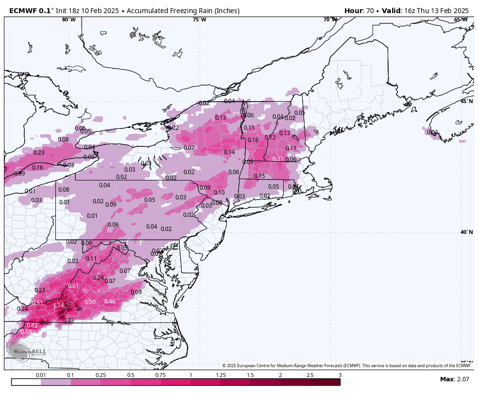 Wednesday Night into Thursday: The anticipated system remains on track, bringing a progression from snow to ice and then to rain. Recent model guidance suggests a slightly faster timeline and more in the way of plain rain during the day on Thursday. This will likely come down to how strong the “CAD” (or Cold Air Damming) is within the system. This can be tricky for models, and often allows the cold air to hang on longer than modeled. There is a CAD signature noted on the right hand image where you can see curvature in the isobars. In general, expect wintry precipitation beginning around 10 PM on Wednesday and continuing until about 7 AM on Thursday. At this point school delays seem quite possible, but will continue to monitor as we get closer.