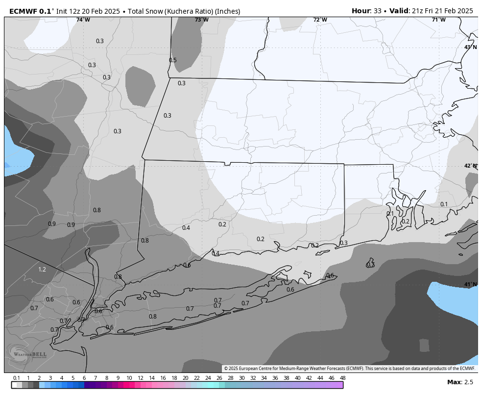 As a larger storm system moves well to the south and east of the area, a trough will swing through this evening providing adequate lift for scattered snow showers across the region. Snow shower activity will impact the area between 5PM and 11PM. A light dusting to a coating of snow (around 0.5”) appears to be the most likely outcome for most of the area. Isolated areas cannot rule out an inch of snow, especially across SW CT and the Hudson Valley.