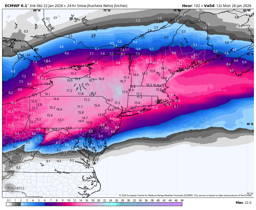 Most ensemble guidance continues to cluster around 6–12 inches for the region. Given the expected light, fluffy nature of the snow, 8–14 inches appears to be a reasonable forecast for much of the area at this time. Higher amounts remain on the table if the coastal low tracks just inside the “sweet spot” near the benchmark.