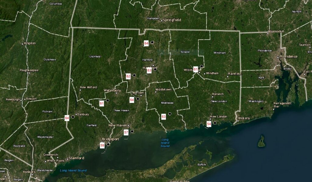 Highs have reached the middle 60s across CT as of 3:30PM Monday. Latest observations below: