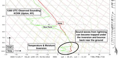 Thunderstorms in New England can occur in any month, but are most common in the spring and summer. While the strength and ice content of a thunderstorm can influence the overall amount of lightning, people often don’t realize that the sound from a thunderstorm can also fluctuate based on atmospheric conditions. For one, the temperature of the air will cause sound waves to move faster or slower. For example, sound waves move with greater velocity through warm air than cold air. To examine the thermal profile of the atmosphere at all layers, meter