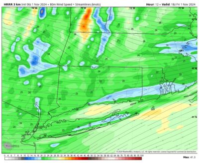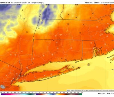 A cold front will approach this morning, with a few showers or sprinkles possible, especially between 8:00AM and 10:30AM. Unfortunately, anything that falls will not amount to much. Behind the front the humidity will rapidly drop, but temperatures will remain very warm during the day. By early afternoon, expect highs approaching 80 degrees with low relative humidity and gusty westerly winds. This is a very concerning setup for more brush fires to rapidly spread if ignition occurs. Winds will gust 30 mph to possibly even 40 mph through the afternoon. Here is a look at the HRRR temperatures and near-surface winds this afternoon.