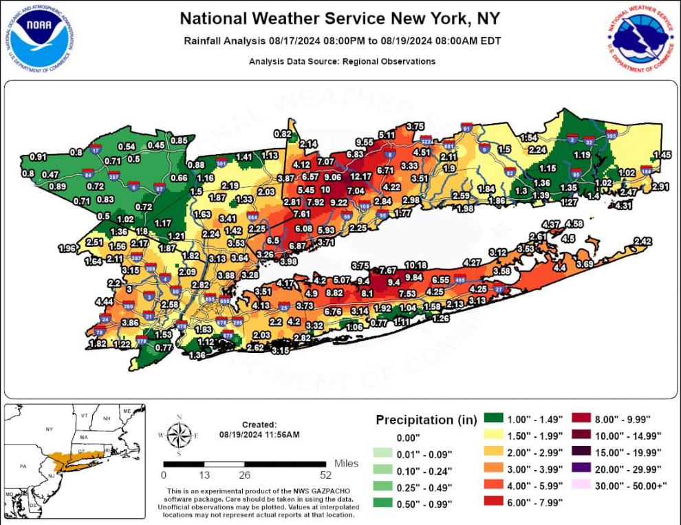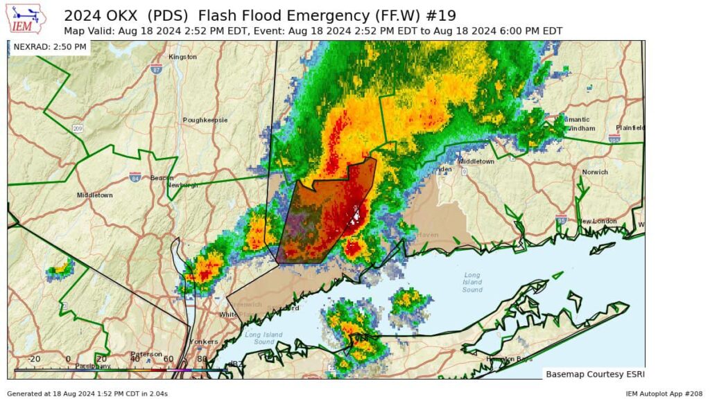I woke up around 7:45AM Sunday and immediately became concerned by the radar, which showed a large batch of heavy showers working into shoreline areas. From there it was a bit of a scramble to get things out, and I pieced together a post hitting the flooding wording harder. Soon after, it was simply real time “nowcasting” as training showers and storms encroached more and more on the area. The first Flash Flood Warning was about 9:30AM and did include many of what ended up being the hardest hit communities. Initially, places like Stamford, Darien, and Norwalk had the most issues, but the flooding quickly spread NE during the morning.