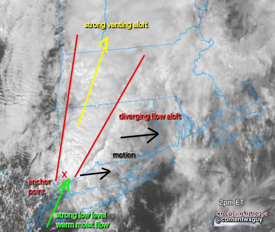 The atmosphere on Sunday was primed for heavy rainfall, and the short range models picked this up, at least to some extent. The column was very moist with PWATs (Precipitable Water) values near 2.0 inches. Additionally, the boundary the storms formed along was very slow moving, meaning storms could continue to fire over and over again in the same spot. This can cause what’s known as “training” thunderstorms. The last key ingredient was the development of a very moist low level jet from the south, which created a conveyor belt of moisture from the Atlantic. This, aided by our local topography, allowed for aggressive rainfall rates within storms. The low level jet (LLJ) was under-modeled rather significantly, and ended up being observed around 45 knots as opposed to an expect 20 knots. Below is a very well done diagram of the meteorological process from @ContentWxGuy on X.