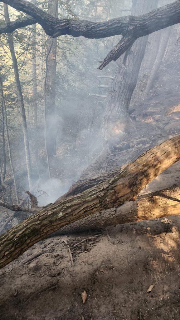 The fire, located along a steep cliff in a remote section of the preserve, has proven challenging due to its terrain and the depth of the burn. Crews from the Washington Fire Department, DEEP Forestry, and mutual aid partners from Warren, Northville, Roxbury, Bantam, and others have been working tirelessly to contain the fire and prevent further spread. A 3-inch hose line stretching over 3,000 feet was hand-carried and deployed deep into the woods to support suppression efforts—an impressive logistical feat given the rugged conditions.