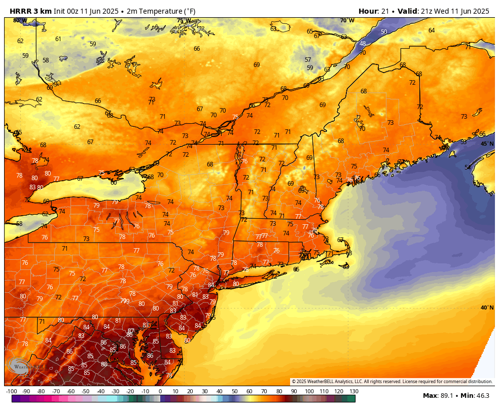 HRRR temps Wednesday afternoon – probably a bit underdone with the June sun angle