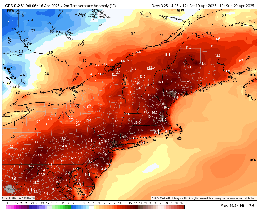 GFS Temperature Anomaly – It will be ~15F to 20F above normal Saturday.