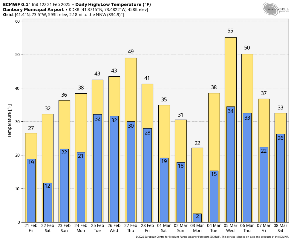 So while it will warm up, and may even get close to 50 degrees early next week, it does look like we spike down again towards the beginning of March. It looks like a bit of a roller-coaster to start what is climatologically the wildest weather month in CT. March is the only month we have recorded temperatures above 90 and below zero!