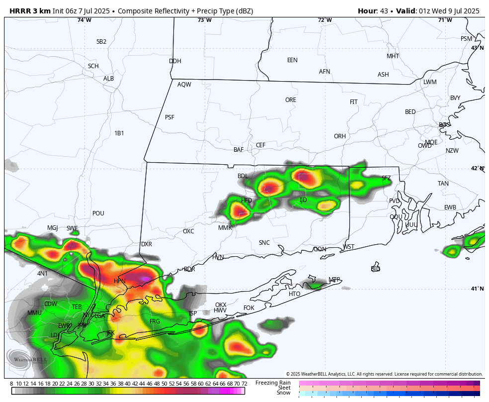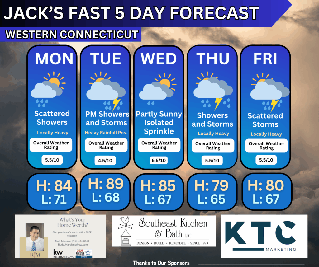 - Afternoon/Evening: Isolated to scattered showers and thunderstorms possible, especially in the Hudson Valley and Western CT. Not expected to be severe, but heavy downpours are possible due to high moisture content.