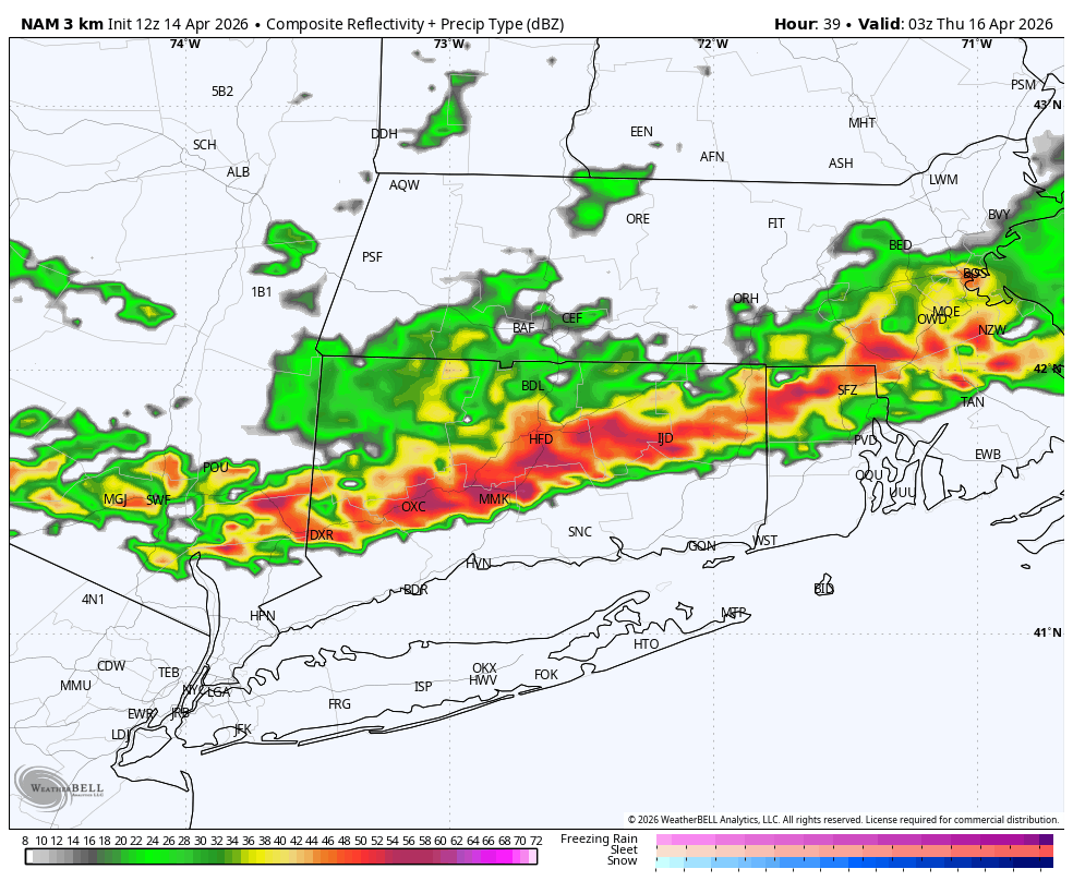 As we head into this evening, forecast models show a line of showers and thunderstorms approaching the region. However, with the loss of daytime heating and limited atmospheric forcing, any activity that does develop should remain brief and on the weaker side. The better chance for stronger storms currently looks to remain north of Connecticut, mainly across parts of Massachusetts. That said, an isolated shower or thunderstorm cannot be completely ruled out later today or this evening, and we’ll continue to monitor trends closely.