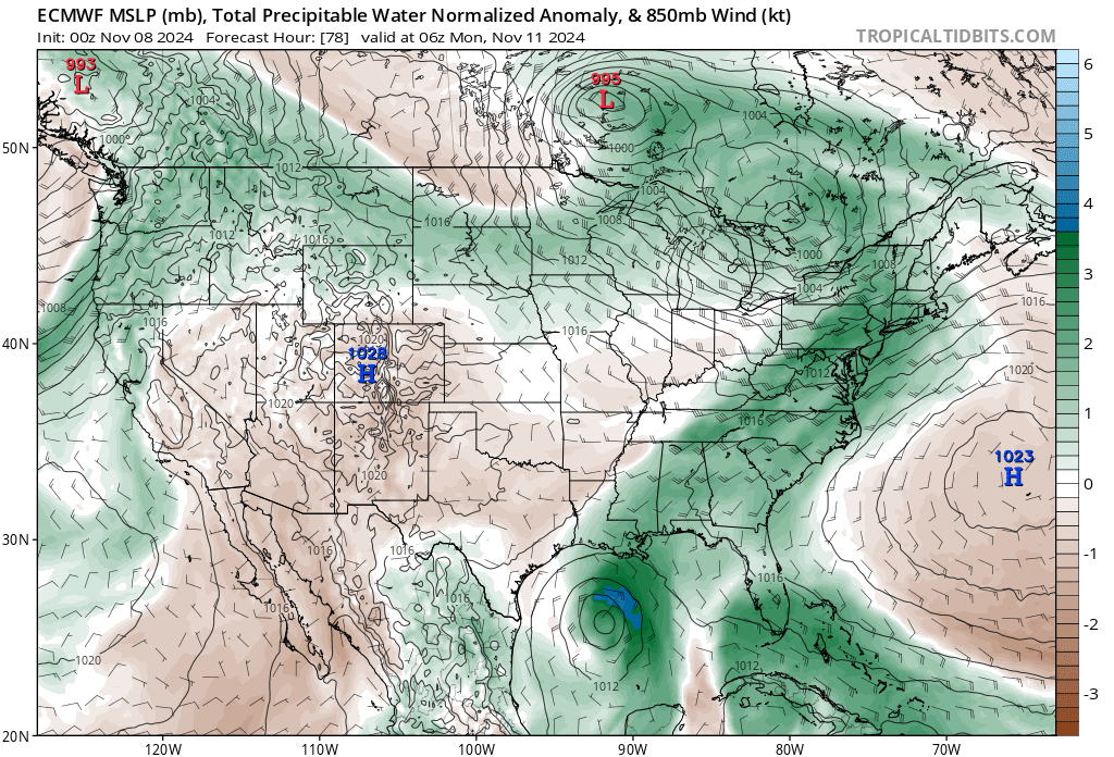 So… when will water actually fall from the sky? Well, we have our first shot at a *decent* rainfall Sunday night in Monday morning as a front approaches from the west. Earlier in the week, it looked like this front had a chance to drag up a decent amount of moisture from Rafael in the Gulf of Mexico, but now it seems certain the connection has mostly been missed. Still though, a moist SW flow and frontal energy should yield the area around 0.25 inches of rainfall or perhaps even a touch more in spots. You can see the flow illustrated below – valid for Sunday night on the European model. While this is not a ‘drought buster’ by any means, at this point anything helps.