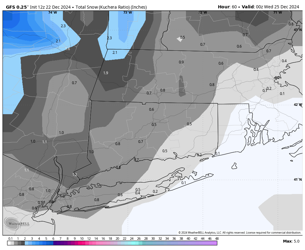 Another “Alberta Clipper” will bring light snow to the region Tuesday morning, with around 0.5 to 1.5 inches expected for many across the state. Bridgeport is modeled to get around an inch of snow. Can that survive a forecast high 38 Tuesday and stay on the ground for Christmas morning? It’s going to be close!